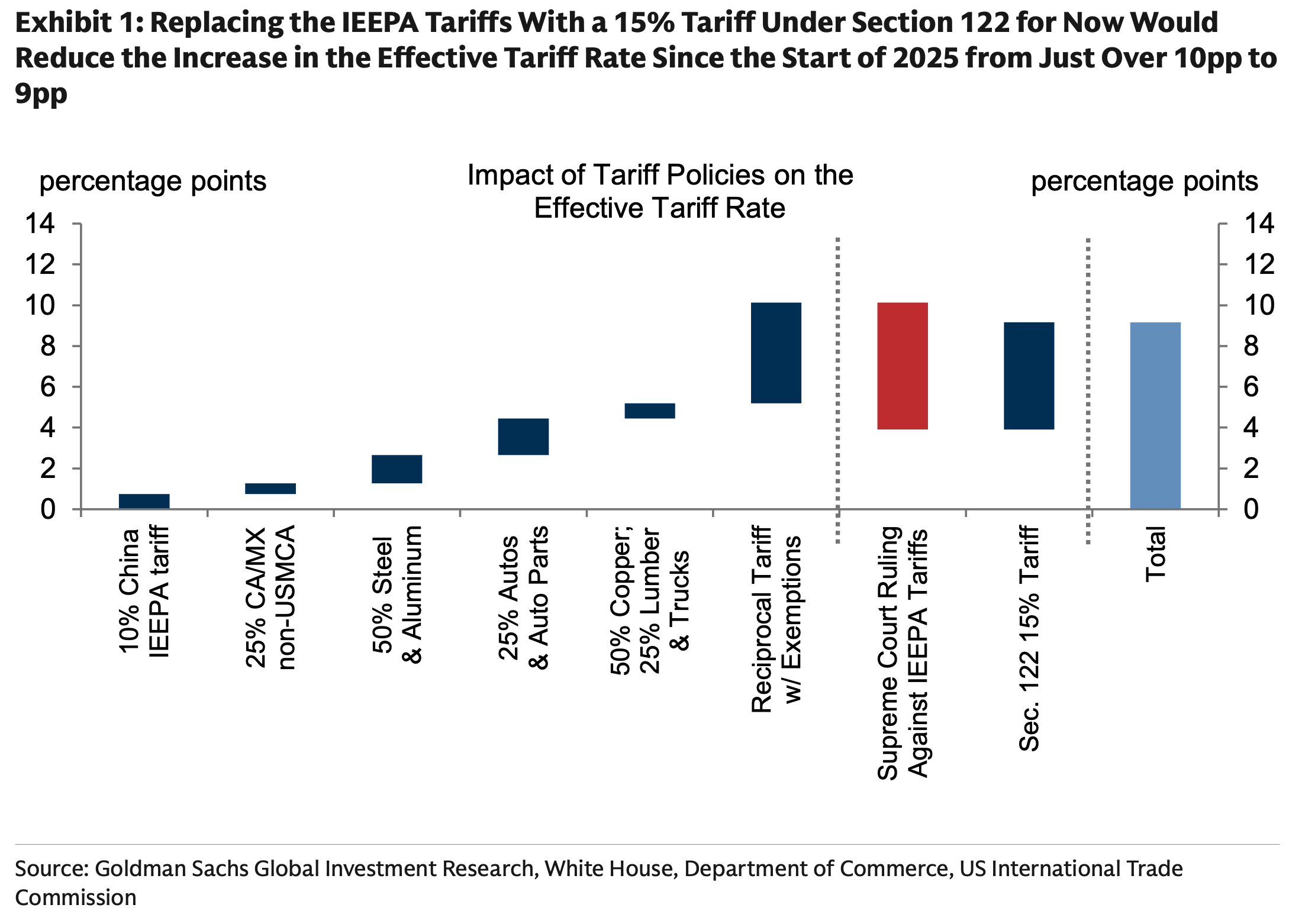 Secondo gli analisti di Goldman Sachs, la combinazione della decisione da parte della Corte Suprema e di quella del Presidente statunitense ridurrà l’aumento dell’aliquota tariffaria effettiva da 10 a 9 punti percentuali da inizio 2025. Tuttavia, questi sviluppi erano attesi e le stime su inflazione e crescita economica non sono variate più di tanto.