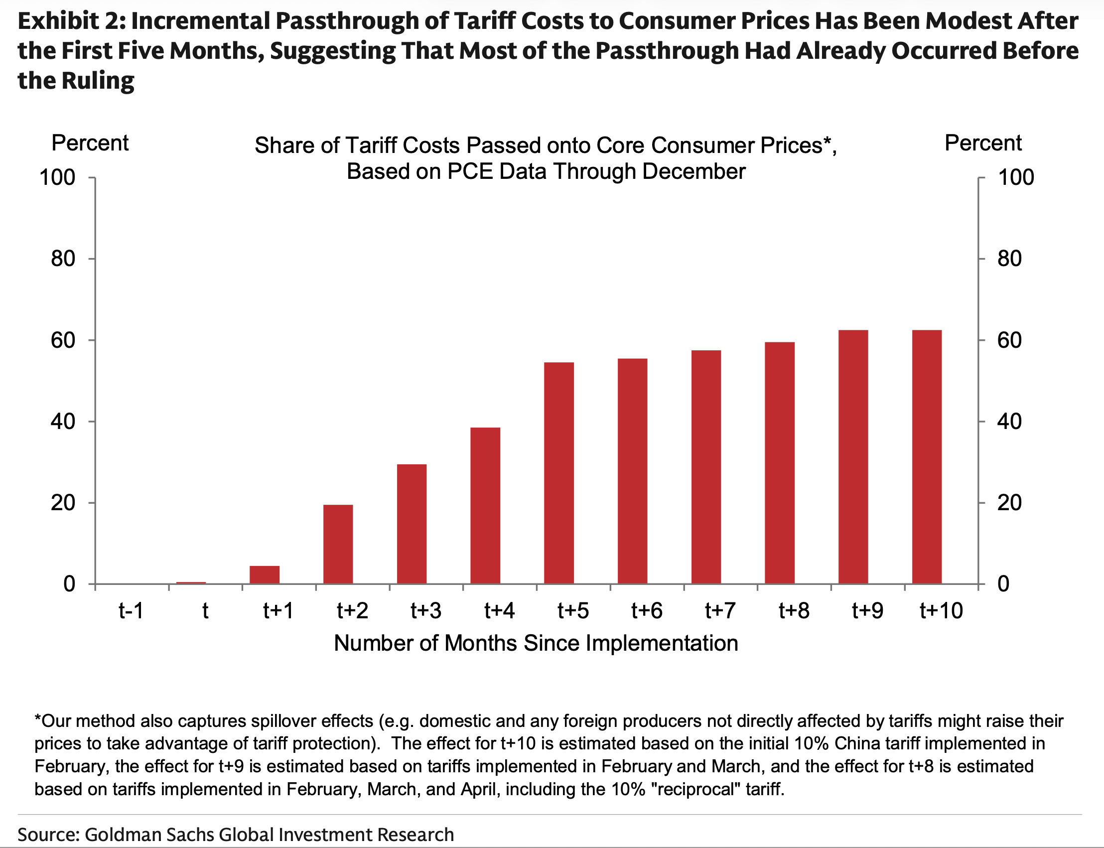 GS evidenzia che la maggior parte del trasferimento dei costi tariffari sui prezzi è già avvenuto e ha aumentato il PCE core dello 0,7% fino a gennaio e lo aumenterà di un altro 0,1% nel resto del 2026.