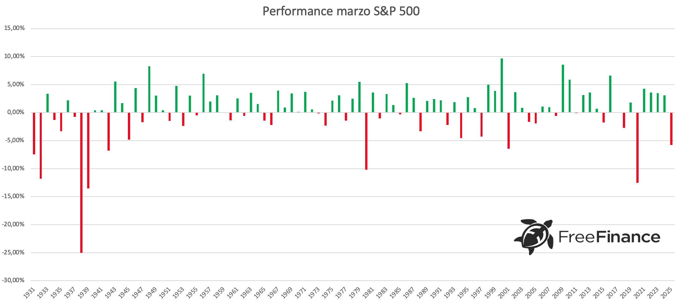 L’S&P 500 ha chiuso marzo in positivo il 61,05% delle volte, con una variazione media del +3,12%. La performance media negativa è stata del -4,04%, mentre quella generale del +0,33%.
