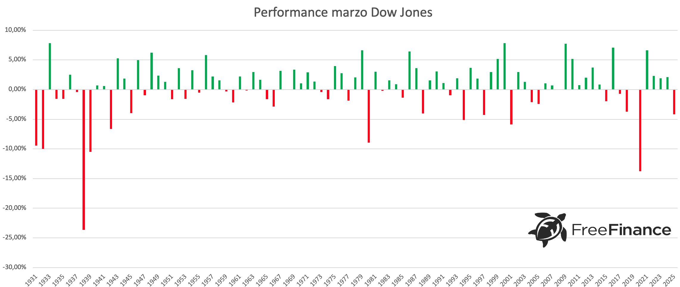 Il Dow Jones ha chiuso il terzo mese dell’anno sopra la parità nel 61,05% delle volte, con una performance media del +3,01%. La variazione media negativa è stata del -3,87%, mentre quella media del +0,33%.