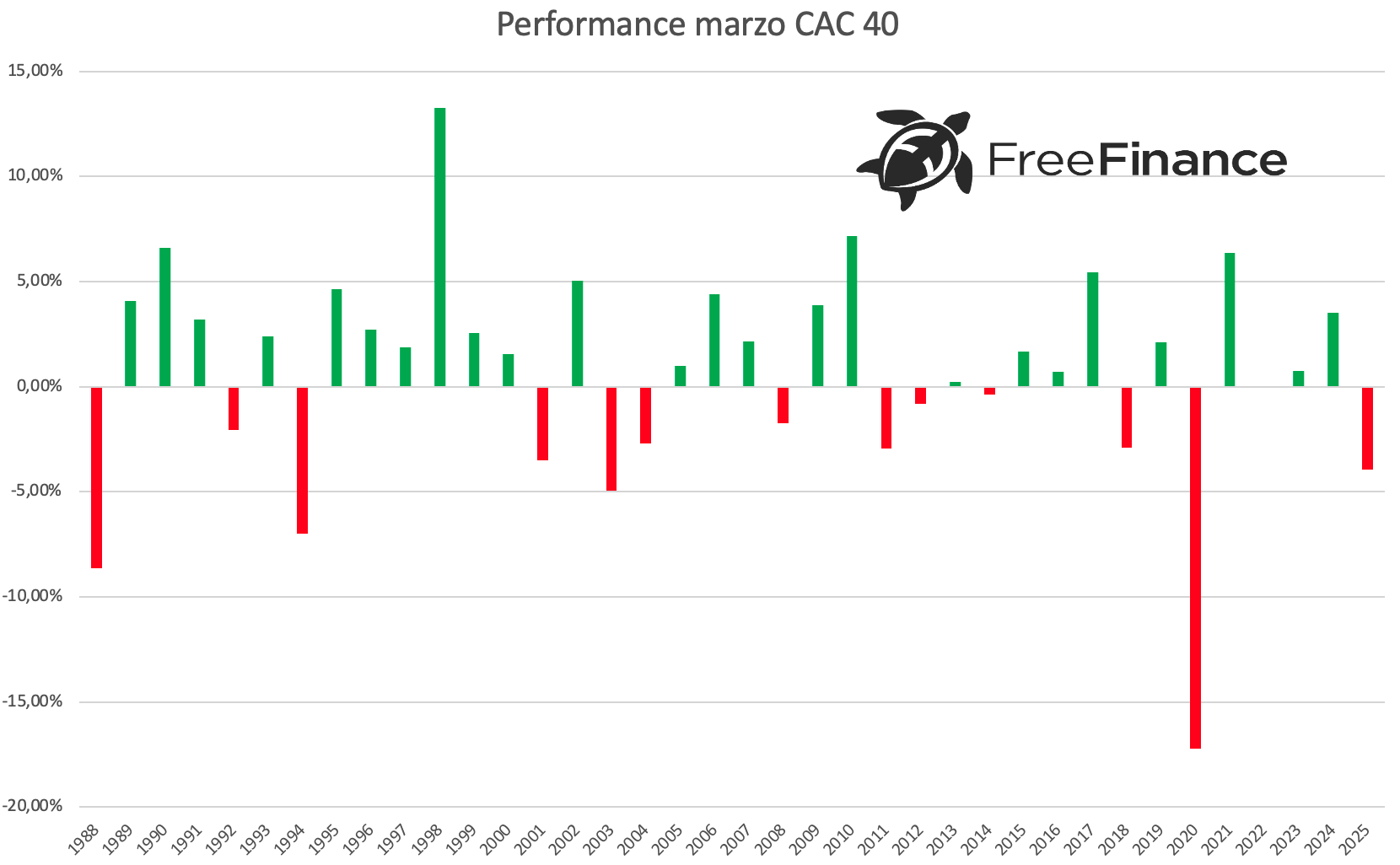 Infine, il CAC 40 ha visto il 65,61% dei mesi di marzo chiudere sopra la parità, con una performance positiva media del +3,49%. La variazione negativa è stata mediamente del -4,52%.