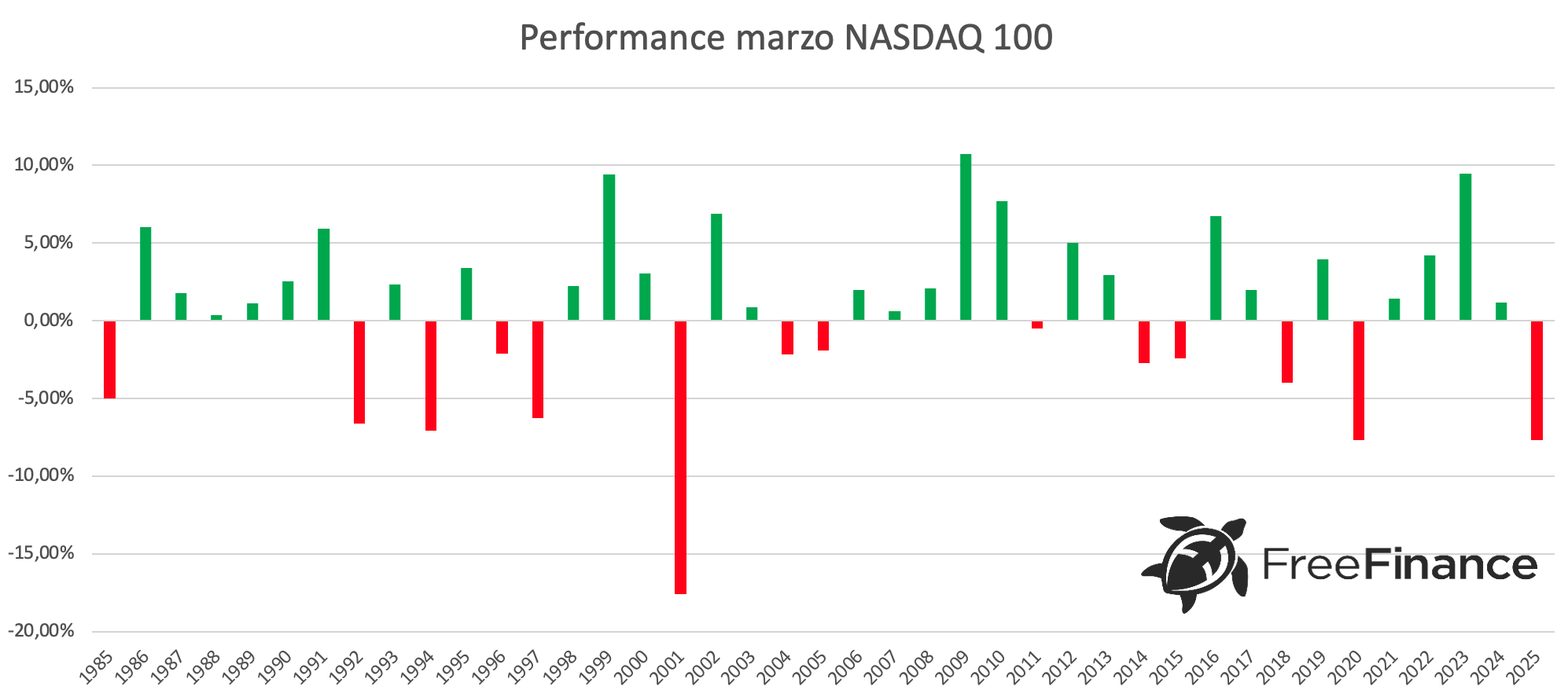Per il NASDAQ 100, marzo ha chiuso in positivo nel 65,85% dei casi. La performance media positiva è del +3,92%, quella negativa del -5,26% e quella generale del +0,79%.
