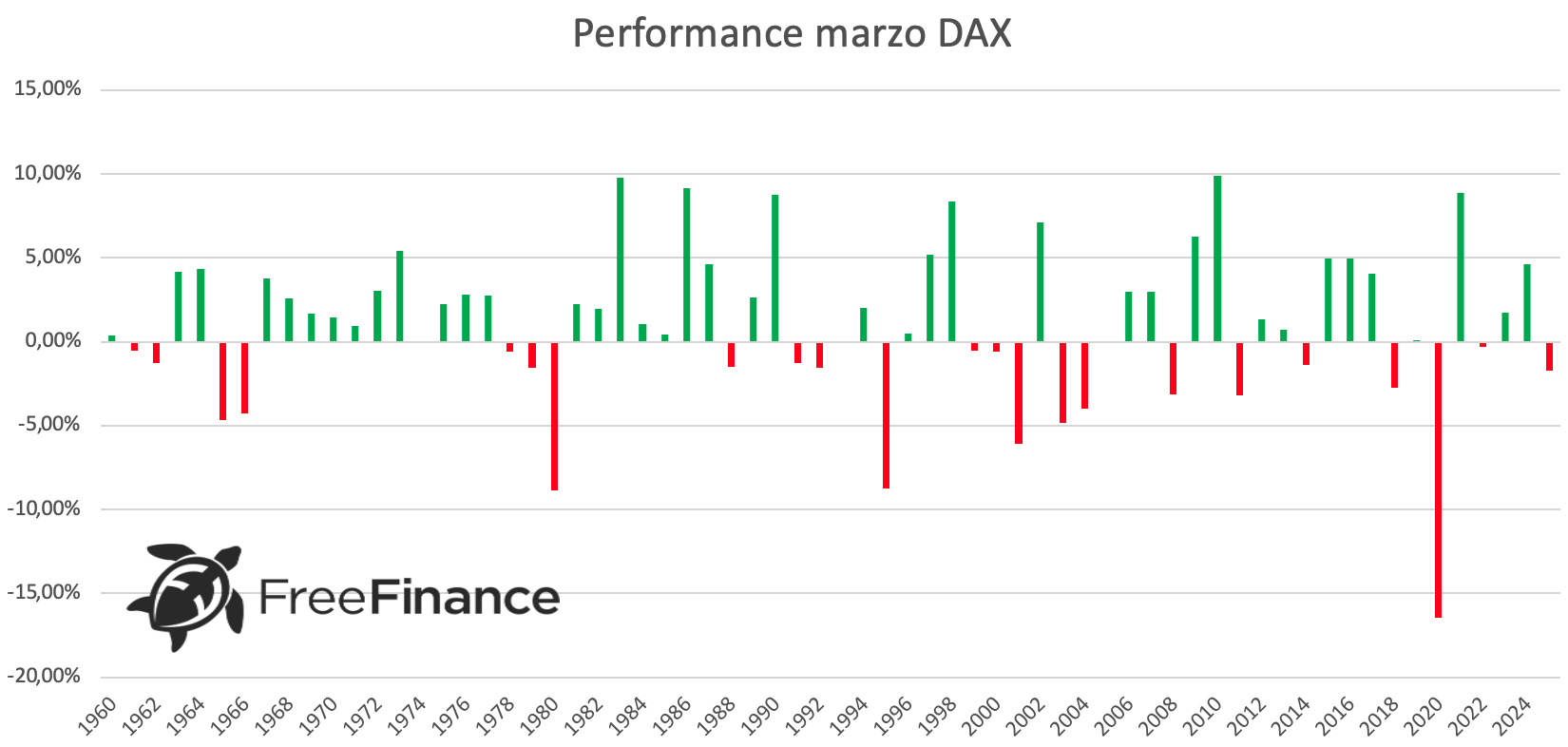 Il DAX ha registrato il 60,61% dei casi positivi. La performance media generale è del +1,1%, quella positiva del +3,81% e quella negativa del -3,08%.
