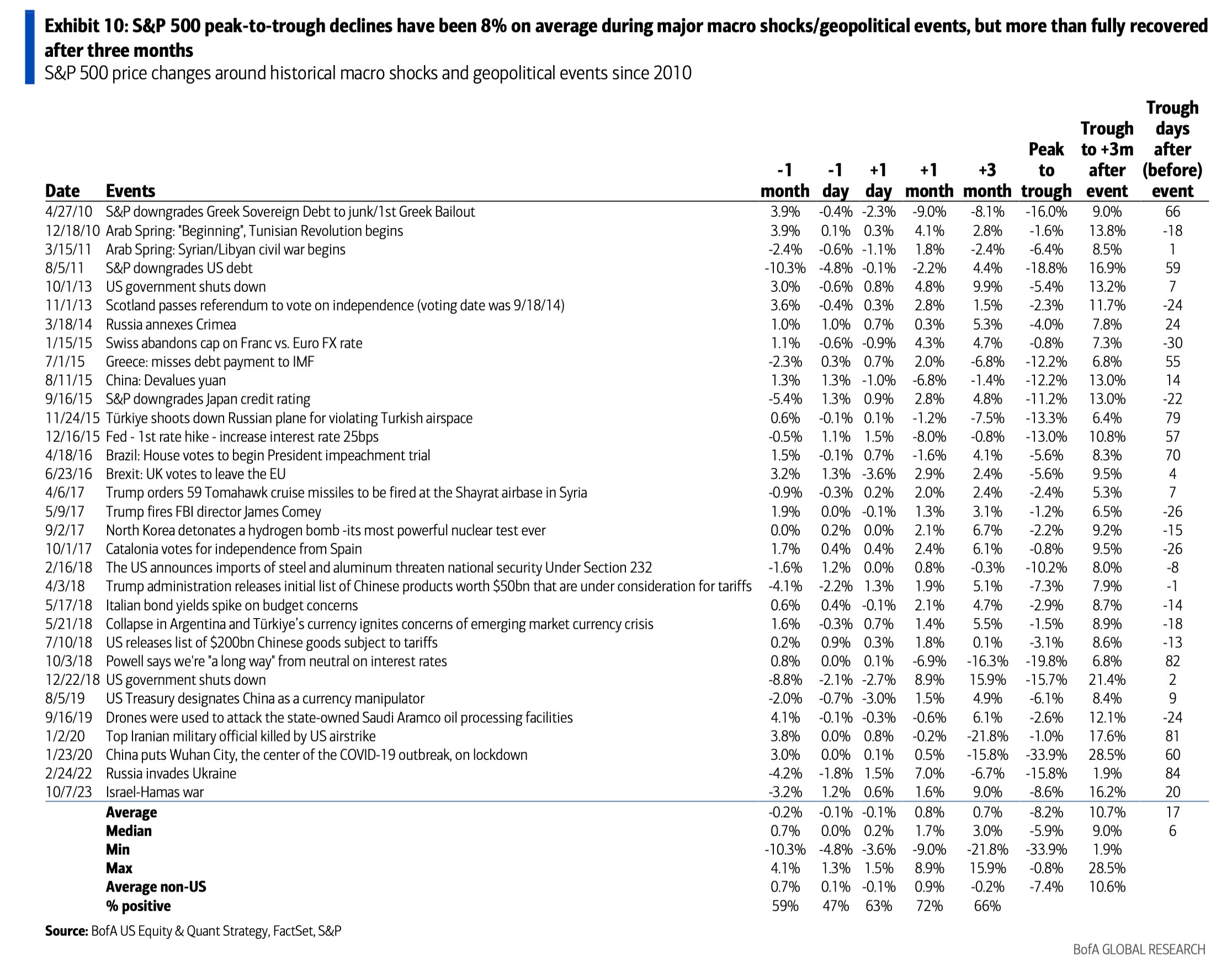 Ma cosa potrebbe succedere alle azioni? Storicamente, BofA evidenzia che gli eventi geopolitici con implicazioni limitate hanno offerto opportunità di acquisto. L’oscillazione negativa media va dal 5% al 10%, recuperata completamente entro in 3 mesi. Questa volta però i saldi di cassa degli istituzionali sono ai minimi da 5 anni, mentre la liquidità disponibile è limitata.