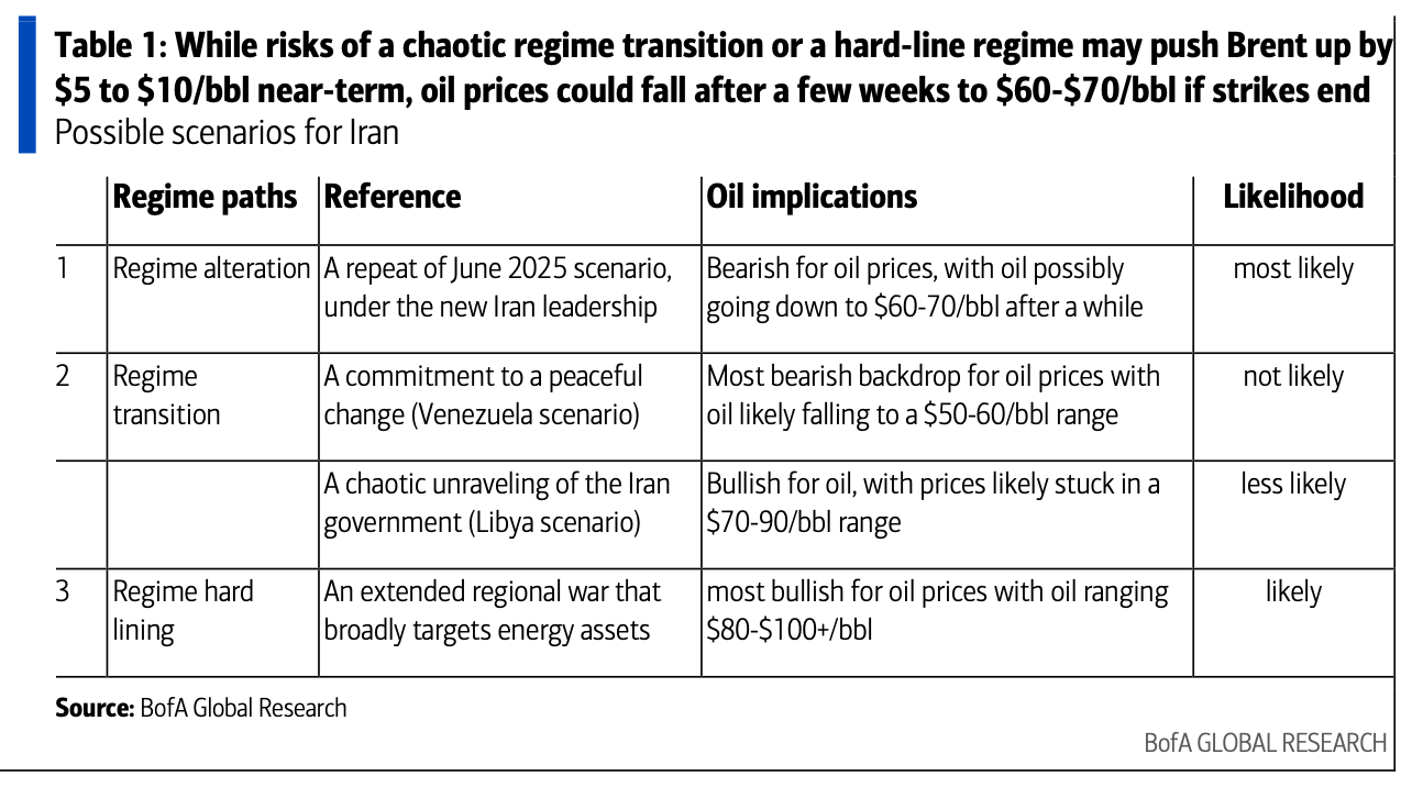 Per BofA non mancano gli scenari ribassisti per l’oro nero. In particolare, un’alterazione del regime sotto una nuova leadership iraniana (stile 2025) potrebbe riportare le quotazioni a 60-70 dollari.